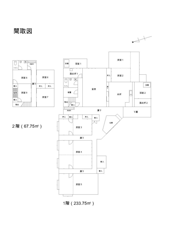間取り:9LDK(居室9、浴室2、トイレ2、食堂、台所)