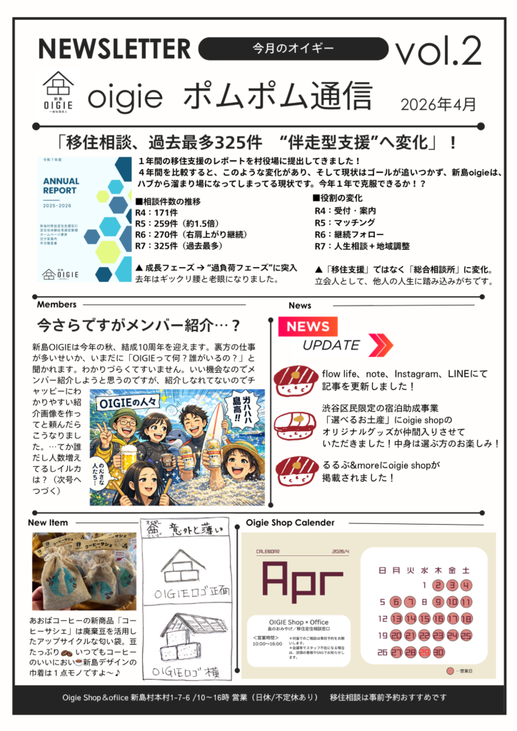 移住定住相談窓口スタッフが制作する新聞「OIGIEポムポム通信」、早くも2号です。メイントピックは移住相談に関する話題です。さくっと読める内容ですので、ぜひどうぞ♪
